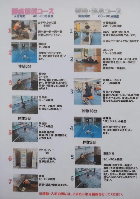運動: フィットネスルーム、トレーニングルーム、プール、温泉歩行浴、各種の温泉が用意され、それらを組み合わせて運動するようになっています。 ↓は腰痛解消コース、運動・温泉コースの例です。 これで、大体のイメージが分かるかも知れません。