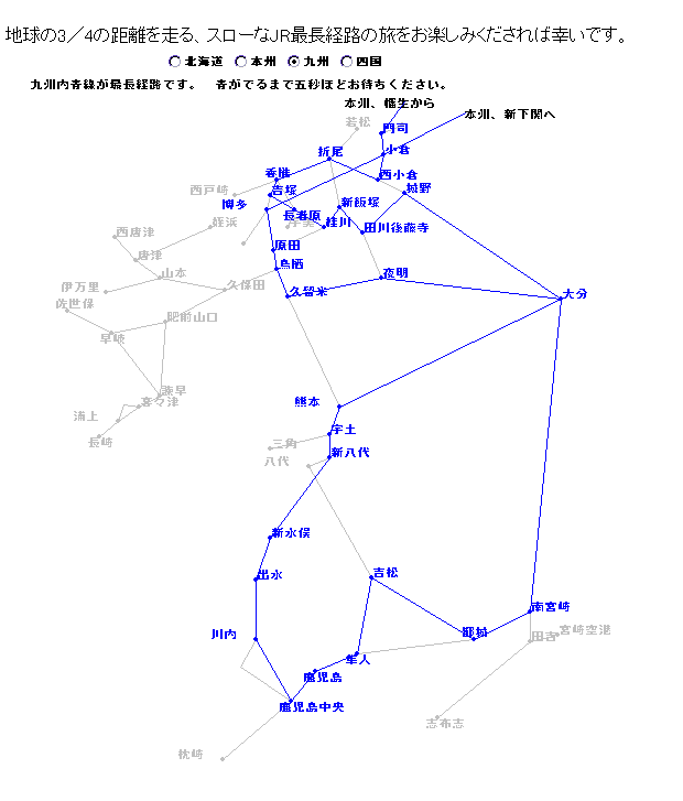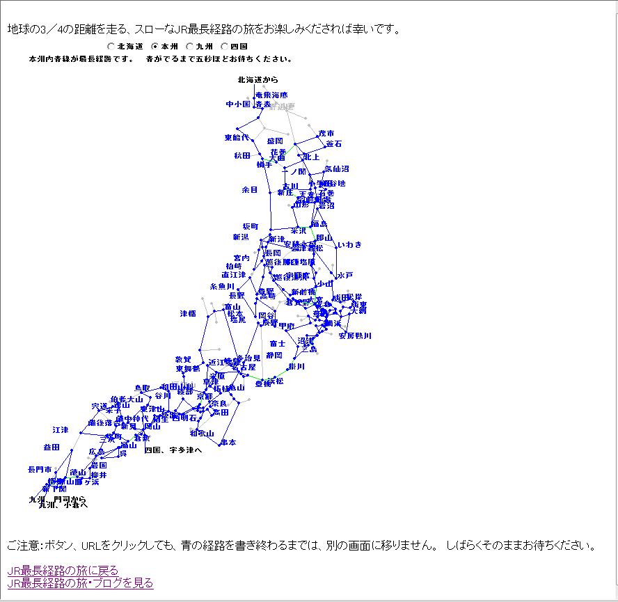 | (竜飛海底=*海峡線=青森=*奥羽本線=川部=*五能線=東能代=*奥羽本線=秋田=*秋田新幹線=大曲=*秋田新幹線=盛岡=*東北新幹線=新花巻=*釜石線=花巻=*東北本線=北上=*東北本線=一ノ関=*気仙沼線=前谷地=*仙石線=仙台=*東北本線=小牛田=*東北本線=一ノ関=*東北新幹線=古川=*陸羽東線=新庄=*山形新幹線=天童=*奥羽本線=新庄=*奥羽本線=横手=*北上線=北上=*東北新幹線=新花巻=*釜石線=盛岡=*田沢湖線=大曲=*奥羽本線=秋田=*羽越本線=余目=*羽越本線=坂町=*米坂線=米沢=*奥羽本線=福島=*山形新幹線=米沢=*奥羽本線=山形=*山形新幹線=天童=*奥羽本線=南出羽=*奥羽本線=羽前千歳=*仙山線=仙台=*東北新幹線=福島=*東北新幹線=郡山=*東北本線=福島=*東北本線=岩沼=*常磐線=いわき=*常磐線=水戸=*水郡線=安積永盛=*東北本線=新白河=*東北本線=黒磯=*東北本線=那須塩原=*東北本線=宇都宮=*東北本線=自治医大=*東北本線=小山=*東北新幹線=宇都宮=*東北新幹線=那須塩原=*東北新幹線=新白河=*東北新幹線=郡山=*磐越西線=会津若松=*磐越西線=喜多方=*磐越西線=新津=*羽越本線=新発田=*白新線=新潟=*信越本線=新津=*信越本線=東三条=*信越本線=長岡=*上越新幹線=燕三条=*上越新幹線=新潟=*越後線=吉田=*越後線=柏崎=*信越本線=宮内=*信越本線=長岡=*上越新幹線=浦佐=*上越線=越後湯沢=*上越新幹線=高崎=*上越新幹線=大宮=*川越線=高麗川=*八高線=倉賀野=*高崎線=大宮=*東北新幹線=上野=*山手線=秋葉原=*山手線=神田=*中央本線=御茶ノ水=*中央本線=代々木=*山手線=大崎=*山手線=品川=*横須賀線=鶴見=*鶴見線=尻手=*南武線=府中本町=*武蔵野線=西国分寺=*武蔵野線=武蔵浦和=*埼京線=大宮=*京浜東北線=南浦和=*武蔵野線=武蔵浦和=*埼京線=北赤羽=*埼京線=赤羽=*京浜東北線=田端=*山手線=池袋=*山手線=新宿=*中央本線=西国分寺=*中央本線=立川=*青梅線=拝島=*八高線=八王子=*中央本線=甲府=*見延線=富士=*東海道本線=静岡=*東海道新幹線=豊橋=*東海道新幹線=三河安城=*東海道本線=豊橋=*東海道本線=静岡=*東海道新幹線=三島=*東海道本線=沼津=*御殿場線=国府津=*東海道本線=小田原=*東海道新幹線=三島=*東海道本線=小田原=*東海道新幹線=新横浜=*横浜線=橋本=*相模線=茅ヶ崎=*東海道本線=大船=*根岸線=横浜=*東海道本線=東神奈川=*横浜線=新横浜=*東海道新幹線=東京=*京葉線=市川塩浜=*京葉線=西船橋=*武蔵野線=新松戸=*武蔵野線=三郷=*武蔵野線=南浦和=*京浜東北線=赤羽=*東北本線=日暮里=*山手線=上野=*東北新幹線=東京=*総武線=錦糸町=*総武本線=西船橋=*武蔵野線=南船橋=*京葉線=蘇我=*外房線=大網=*内房線=蘇我=*内房線=千葉=*総武本線=佐倉=*総武本線=成東=*総武本線=成田=*総武本線=我孫子=*常磐線=友部=*水戸線=小山=*東北新幹線=大宮=*東北本線=小山=*両毛線=新前橋=*上越線=越後湯沢=*上越新幹線=浦佐=*上越線=小出=*上越線=越後川口=*飯山線=豊野=*信越本線=直江津=*北陸本線=糸魚川=*大糸線=松本=*篠ノ井線=長野=*長野新幹線=佐久平=*八ヶ岳高原線=小淵沢=*中央本線=岡谷=*中央本線=辰野=*中央本線=塩尻=*中央本線=多治見=*中央本線=金山=*東海道本線=三河安城=*東海道新幹線=名古屋=*関西本線=桑名=*関西本線=亀山=*紀勢本線=和歌山=*阪和線=天王寺=*大阪環状線=京橋=*片町線=木津=*関西本線=柘植=*草津線=草津=*東海道本線=米原=*北陸本線=近江塩津=*湖西線=山科=*東海道本線=京都=*東海道本線=新大阪=*山陽新幹線=西明石=*山陽本線=尼崎=*JR東西線=京橋=*大阪環状線=大阪=*東海道本線=新大阪=*東海道新幹線=京都=*東海道新幹線=米原=*東海道新幹線=名古屋=*東海道本線=岐阜=*高山本線=美濃太田=*高山本線=富山=*北陸本線=敦賀=*小浜線=綾部=*山陰本線=京都=*奈良線=木津=*関西本線=奈良=*桜井線=高田=*和歌山線=王寺=*関西本線=天王寺=*大阪環状線=大阪=*山陽本線=尼崎=*福知山線=谷川=*加古川線=加古川=*山陽本線=西明石=*山陽新幹線=姫路=*播但線=和田山=*山陰本線=鳥取=*因美線=東津山=*姫新線=姫路=*山陽本線=相生=*山陽本線=東岡山=*赤穂線=相生=*山陽新幹線=岡山=*津山線=津山=*姫新線=新見=*伯備線=総社=*吉備線=岡山=*山陽本線=倉敷=*山陽本線=新倉敷=*山陽新幹線=福山=*福塩線=塩町=*福塩線=備後落合=*芸備線=備中神代=*伯備線=伯耆大山=*山陰本線=宍道=*山陰本線=江津=*三江線=三次=*芸備線=広島=*山陽新幹線=徳山=*山陽新幹線=新山口=*山陽新幹線=厚狭=*山陽本線=新下関=*山陽新幹線=小倉=*鹿児島本線=西小倉=*鹿児島本線=折尾=*鹿児島本線=香椎=*鹿児島本線=吉塚=*篠栗線=長者原=*篠栗線=桂川=*筑豊本線=新飯塚=*後藤寺線=田川後藤寺=*日田彦山線=城野=*日豊本線=大分=*日豊本線=南宮崎=*日豊本線=都城=*えびの高原線=吉松=*肥薩線=隼人=*日豊本線=鹿児島中央=*鹿児島本線=川内=*九州新幹線=新八代=*鹿児島本線=熊本=*阿蘇高原線=大分=*ゆふ高原線=夜明=*ゆふ高原線=久留米=*鹿児島本線=鳥栖=*鹿児島本線=原田=*鹿児島本線=博多=*山陽新幹線=*鹿児島本線=小倉=幡生=*山陽本線=新下関=*山陽新幹線=厚狭=*美弥線=長門市=*山陰本線=益田=*山口線=新山口=*山陽本線=宇部=*山陽本線=小野田=*小野田線=居能=*宇部線=新山口=*山陽本線=徳山=*山陽本線=櫛ヶ浜=*岩徳線=岩国=*山陽本線=広島=*