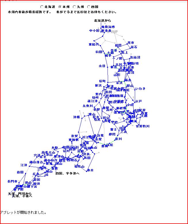 3.3 最長経路解| (稚内駅=*宗谷本線=新旭川=*石北本線=東釧路=*根室本線=新得=*根室本線=富良野=*富良野線=旭川=*函館本線=深川=*函館本線=滝川=*函館本線=岩見沢=*室蘭本線=追分=*室蘭本線=沼ノ端=*千歳線=南千歳=*千歳線=白石=*函館本線=桑園=*函館本線=長万部=*函館本線=竜飛海底=*本州へ) |