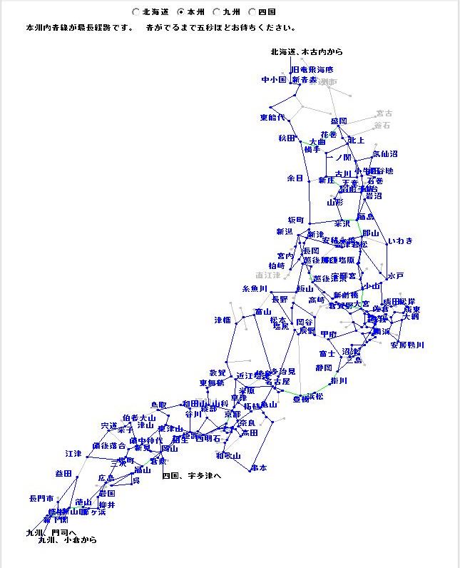 3.3 最長経路解| (稚内駅=*宗谷本線=新旭川=*石北本線=東釧路=*根室本線=新得=*根室本線=富良野=*富良野線=旭川=*函館本線=深川=*函館本線=滝川=*函館本線=岩見沢=*室蘭本線=追分=*室蘭本線=沼ノ端=*千歳線=南千歳=*千歳線=白石=*函館本線=桑園=*函館本線=長万部=*函館本線+北海道新幹線=木古内=*本州へ) |